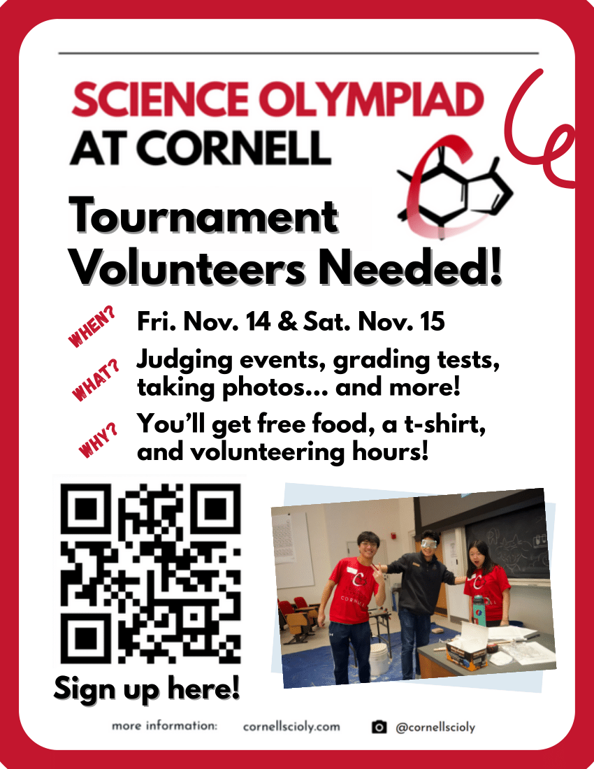 Looking for a fun and rewarding way to get involved on campus? Consider volunteering for Science Olympiad at Cornell! Each year, we host one of the largest invitational Science Olympiad tournaments, bringing together hundreds of students for a day of STEM competition and excitement. And we need your help to make it happen!
